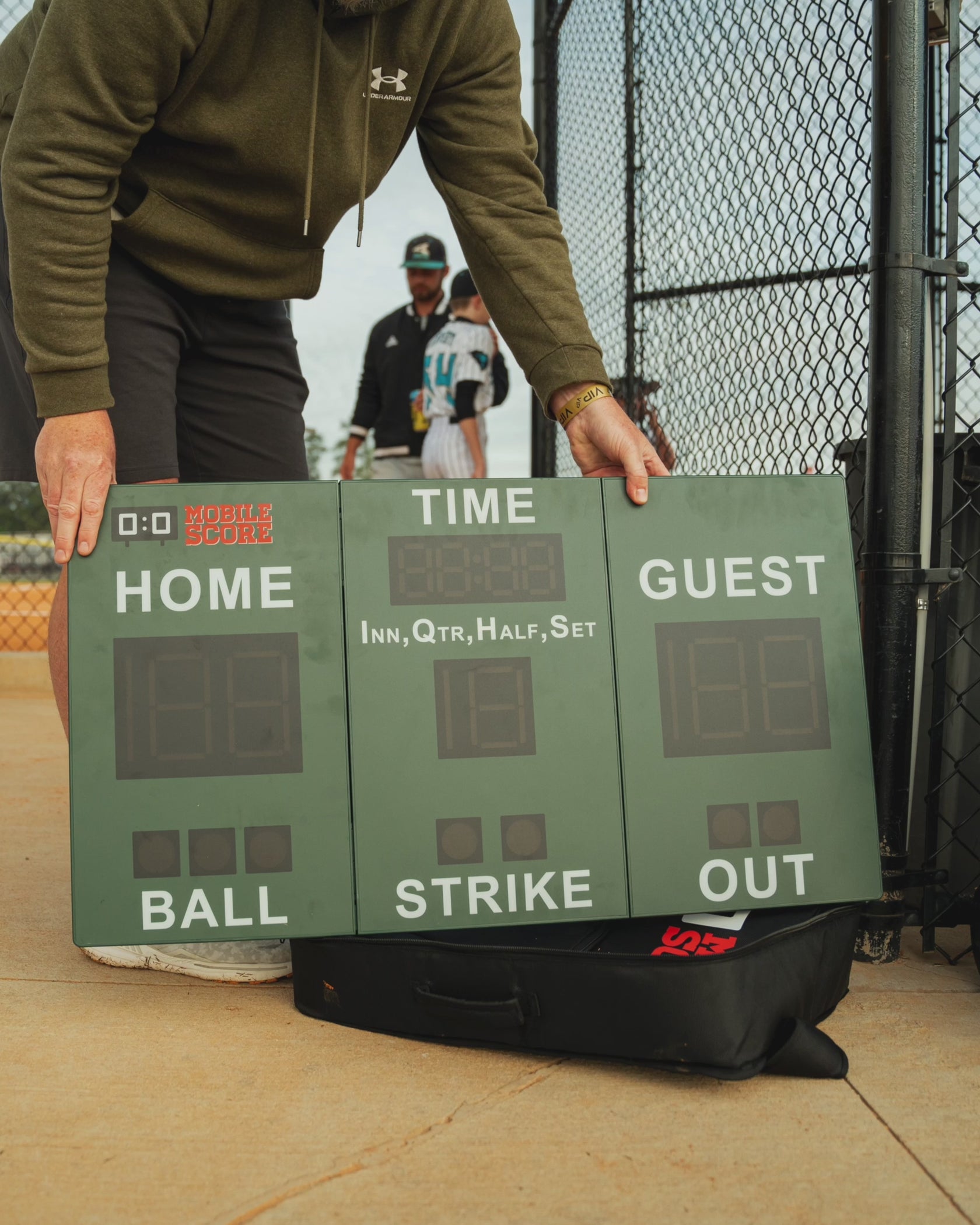 Each kit includes: 1 Scoreboard with Free Scorekeeper App, 1 Rechargeable Battery, 1 AC Adapter, 1 Easel Stand, 4 Hanging Hooks, 1 Travel Backpack